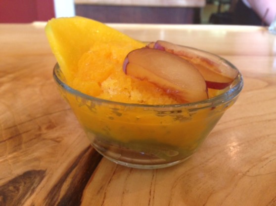 Mango Granita, Our Featured Dessert Posted on June 21, 2013 by Carmen's Bistro It starts with some Kiwi Slices, layered in. Bowl with Fresh Mango. Next we fill it up with Shaved Mango Ice, made fresh for your delight. Top it off with sliced plums. The hardest part is writing a description before I pick up my spoon. Share: Click to email a link to a friend (Opens in new window) Email Click to share on Tumblr (Opens in new window) Tumblr Click to share on Facebook (Opens in new window) Facebook Click to share on X (Opens in new window) X Click to print (Opens in new window) Print Click to share on LinkedIn (Opens in new window) LinkedIn Click to share on Pinterest (Opens in new window) Pinterest Click to share on Reddit (Opens in new window) Reddit Click to share on Pocket (Opens in new window) Pocket Like Loading...