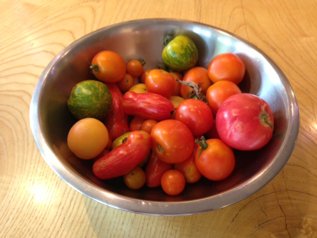 Jim gives sawdust from his wood shop to Steve, who has the garden across the street. Steve just brought us two big bags of his heirloom tomatoes, raised from seed with love.
