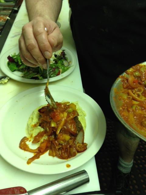 Resting on Garlic Mashed Potatoes, garnished with Onion-Olive-Sweet Pepper and Tomato Sauce.