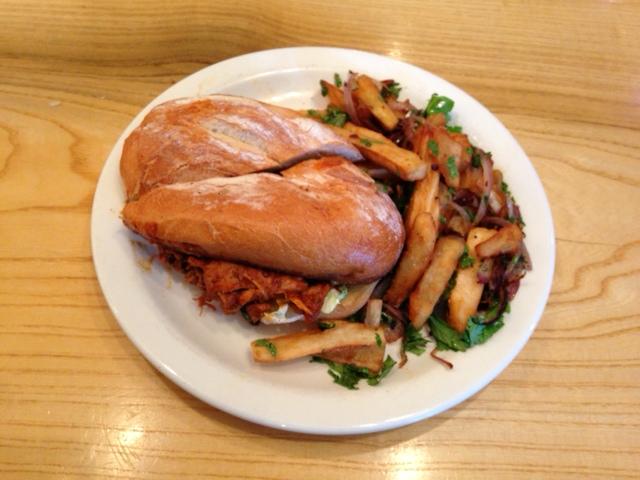 We start with a grilled Portuguese Roll, heaped with mildly spiced, braised chicken thighs, layered with celery, carrot and slivered Brussels sprout slaw.