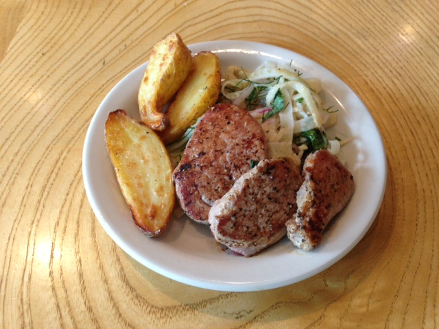 Tasty rounds of Pan Seared Pork with Potatoes and Jicama Slaw.