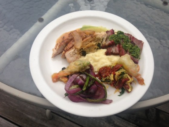 From the top going clockwise: Chicken, stuffed with Rice and Kale; Short Ribs of Beef; Fried Squash Blossoms stuffed with Goat Cheese; Marinated shredded Squash with Sun-Dried Tomato; Grilled Asparagus and Red Onion; and another Fried Squash Blossom stuffed with Goat Cheese; plus Puréed Potato in the center.