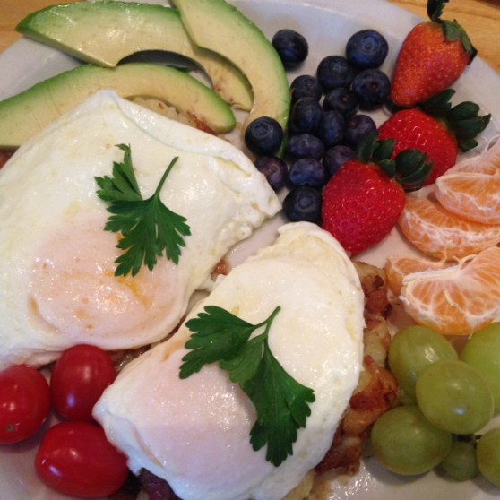 Bacon and Eggs, but where’s the bacon? In the potato pancakes, along with the scallions! And if bacon & eggs are great, bacon, eggs & potato pancakes are fantastic!