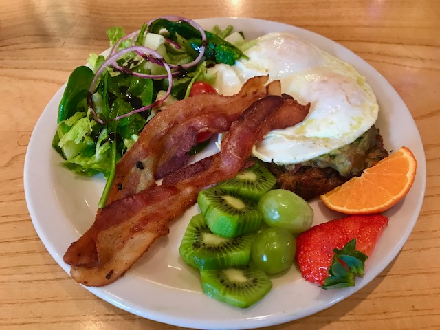 We start with brown rice, add herbs and spices and bake them just so, then flash fry them for a crispy outside and soft inside. Top it with our own guacamole — Yum Yum! Hook that up with a side salad and some breakfast bacon – apple smoked.
