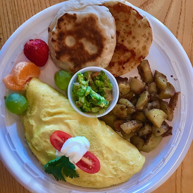 Black bean omelettes are back. A delectable concoction of retried black beans, onion, tomato, cilantro, and just a hint of jalapeño. Melt on a generous helping of extra sharp cheddar and too with a dab of Lime Creme and— voilá!