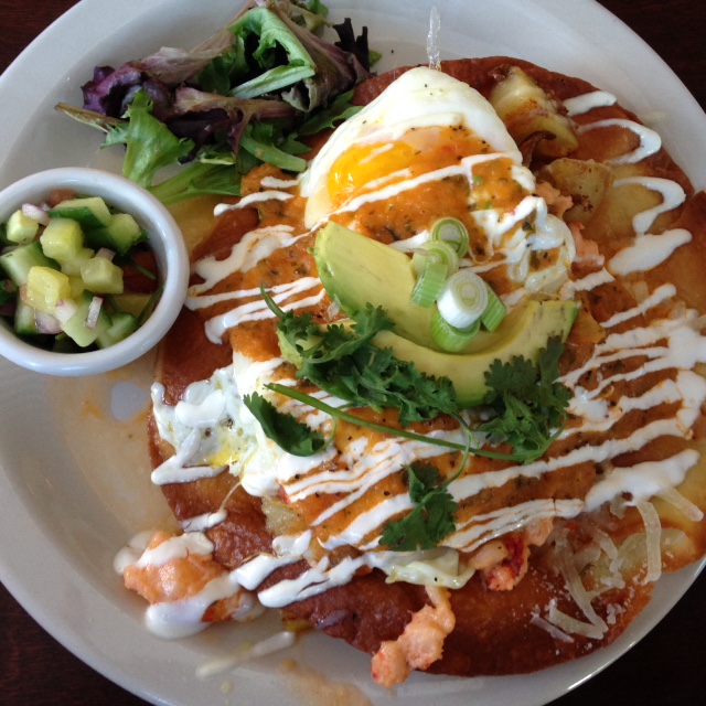 Picture this:  a crispy fried taco topped with home fries and chorizo or veggie hash, manchego cheese, and a pair of sunnyup eggs—  then some spring greens and avocado.  And don’t forget the ranchero sauce or the lime crema on top!