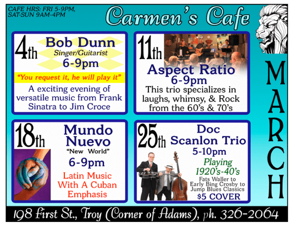 Cafe open from 5–10pm with music in two live shows from 6–7:30 or 8–9:30 5$ Cover.